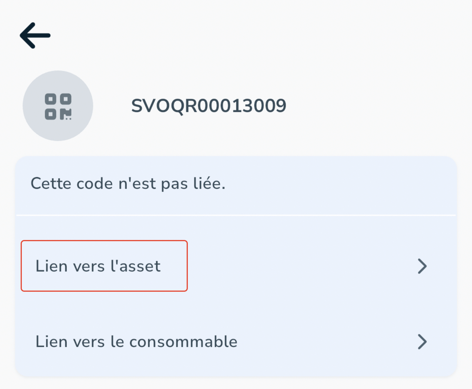 Après environ 3 secondes, le message disparaît et vous pouvez associer le code QR à un bien ou à un produit consommable.