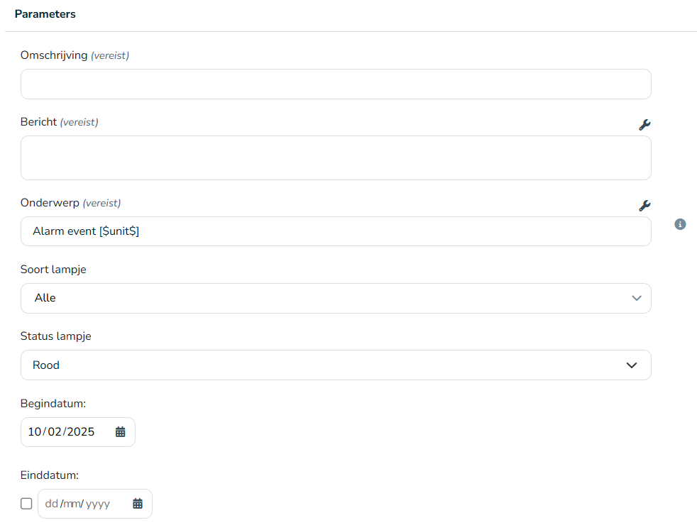 Bericht: In het bericht kan je als gebruiker een aantal parameters toevoegen. Het bericht is de inhoud van de mail die je ontvangt. Selecteer het icoon moersleutel om parameters toe te voegen.