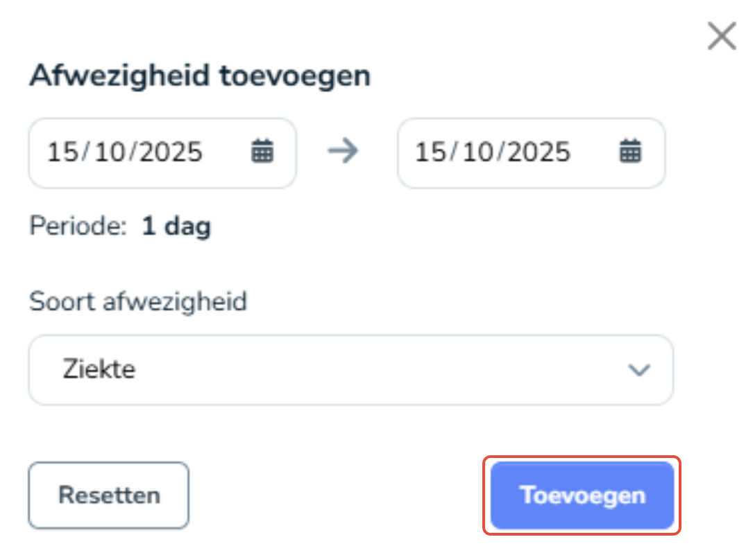 Selecteer de knop "Toevoegen" om de afwezigheid te registreren.