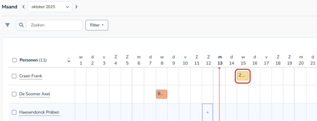 Ga met de mouse pointer naar de dag waar je afwezigheid wenst te registreren voor één medewerker.
