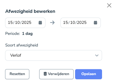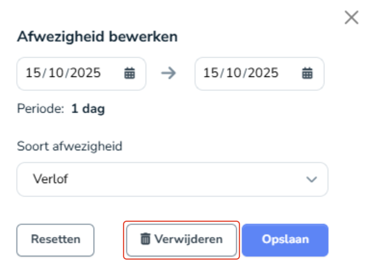 Om de geregistreerde afwezigheid te verwijderen selecteer je de knop "Verwijderen".