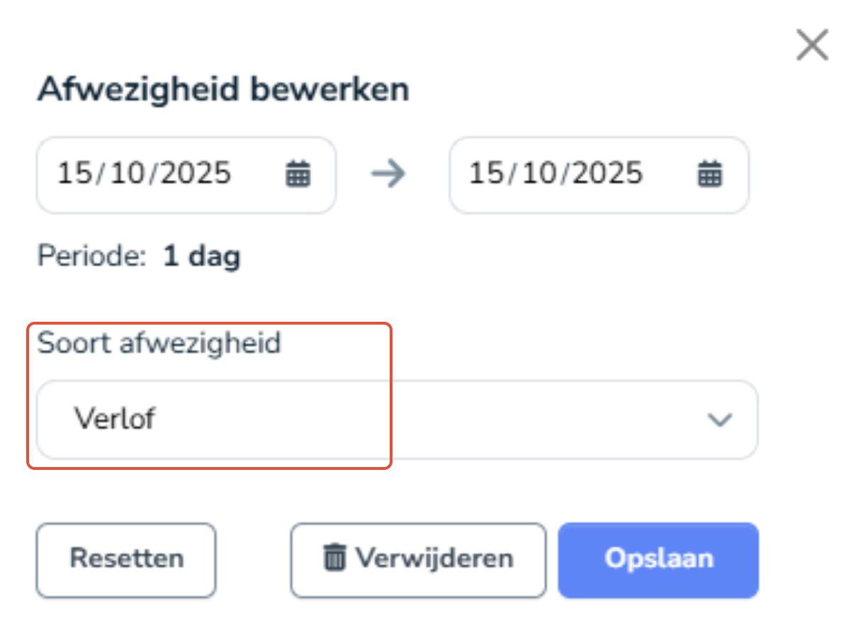 Een HR medewerker kan dit type afwezigheid van "verlof" bijvoorbeeld omzetten naar "familiaal verlof".