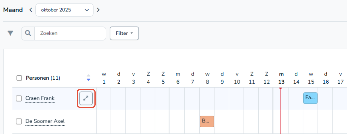 Standaard wordt er een maandoverzicht getoond van alle werknemers of werknemers waartoe een gebruiker recht heeft om dit te bekijken.